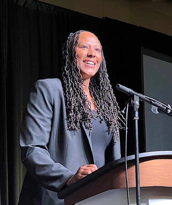 Chamique Holdsclaw speaking last week at Knoxville Convention Center during a luncheon for Volunteer Ministry Center.