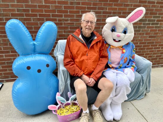 My sports-loving husband, Alan Carmichael, posed with the Easter Bunny and giant blue Peep at Covenant Health Park on Sunday.