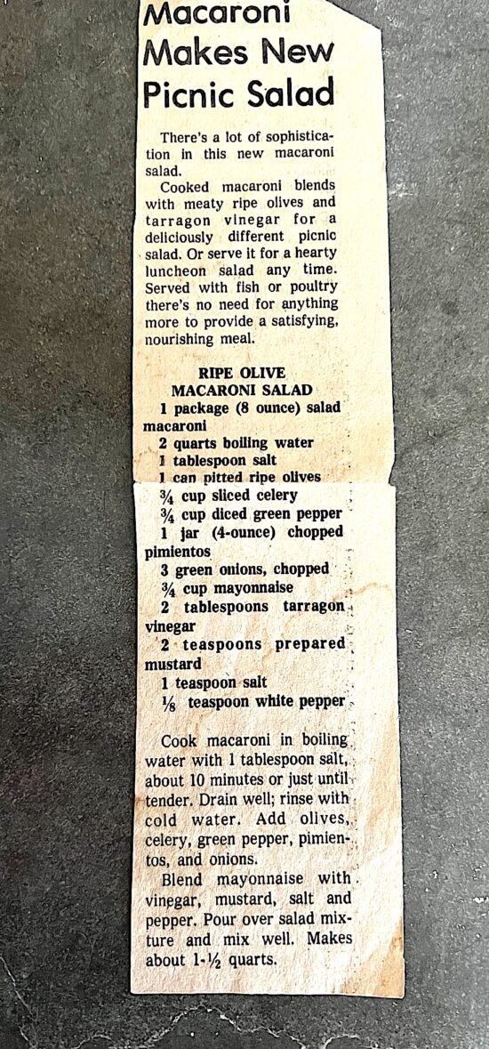 There is a request in the comments for the macaroni salad recipe. Here it is, straight out of the Columbus (Ga.) Ledger-Enquirer about 50 years ago: