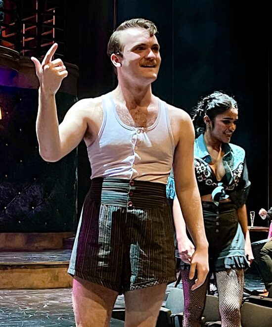 I think this is partly due to the $26 million Jenny Boyd Theatre itself. The flexibility of the theater’s design allows the viewing area to be set up in three different configurations. The one Friday night was called “the thrust configuration.” In this arrangement, the stage juts into the audience allowing seating on three sides. The intimacy this allows almost made the audience feel as if we were actually inside the Kit Kat Club, where the play is set.