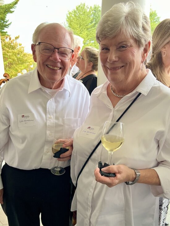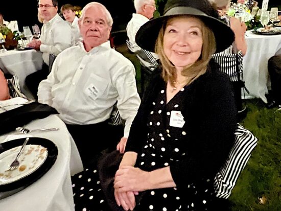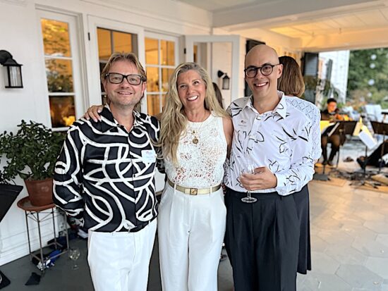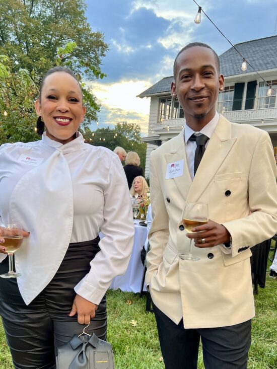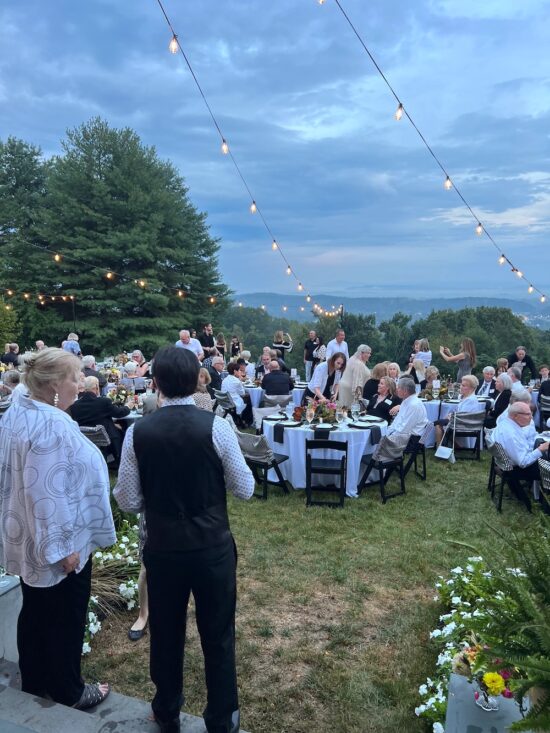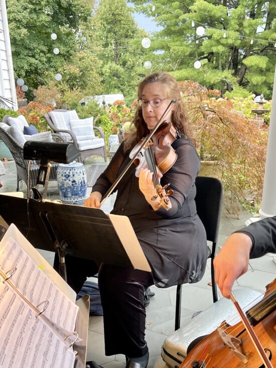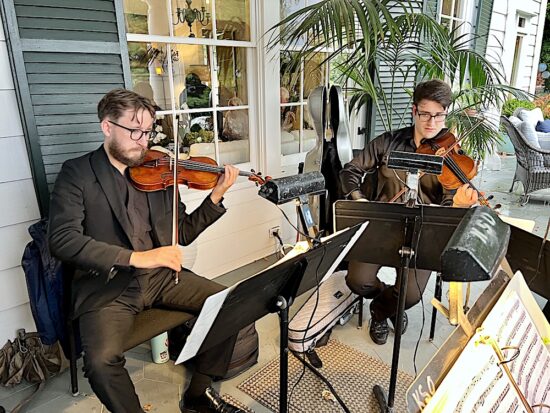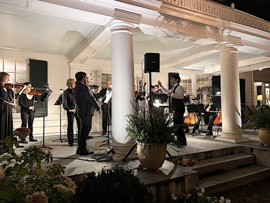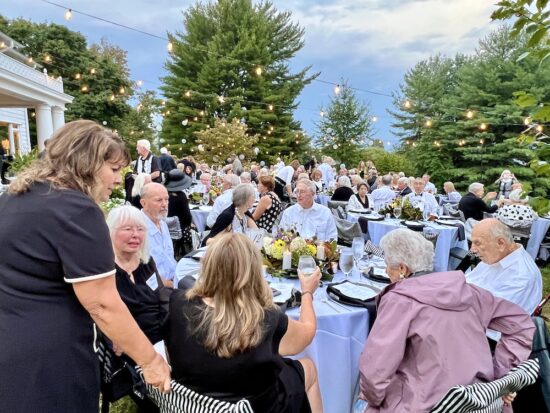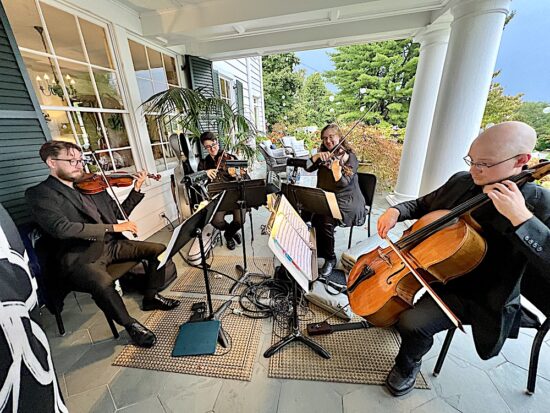 The League sent out text messages for guests to delay their arrival, but few received the word in time. The League volunteers frantically covered the already-set tables in the yard of Ridgefield Manor with plastic tarps to hopefully keep them somewhat dry. And they hearded arriving guests into the home’s carriage house for cocktails and hors d’oeuvres instead of serving them on the porch and the lawn as they had planned. A quartet of Symphony musicians, which were set up to perform on a platform on the lawn, was moved under the cover of the porch.