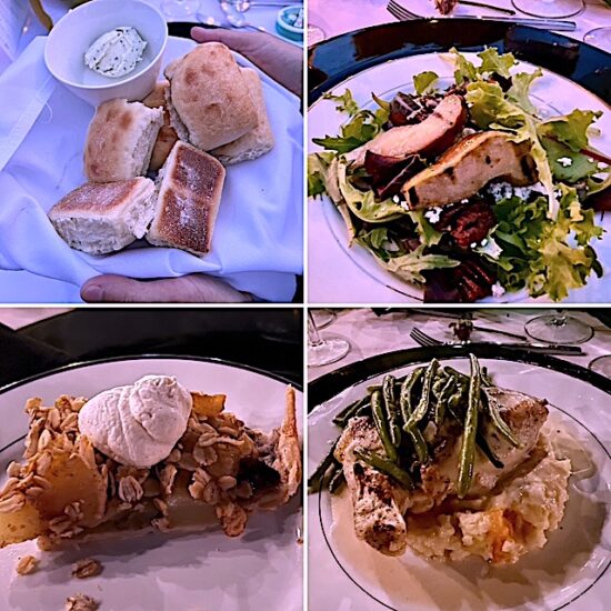 Dinner, which came from By the Tracks Catering, was beautiful and tasty. Clockwise, from top left: artisan rolls and butter; a salad of local greens, grilled pears, goat cheese crumbles, and candied pecans with apple cider vinaigrette; roasted airline chicken breast with Dijon sauce, risotto, and roasted butternut squash; and apple slab pie with spiced Chantilly cream.
