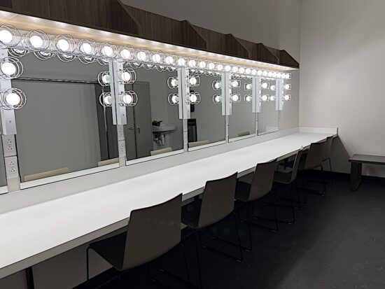 Also backstage, a “green room,” which is a kind of waiting room for performers before they go on stage. Other new spaces: an AV shop; a prop room; a costume room that has two washers, two dryers, and a wig steamer (!); and a stage management area, among others.