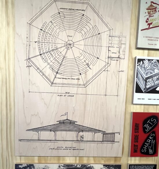 Design drawings for the original Carousel Theatre built in 1952. It replaced a tent with sawdust flooring that was used for productions in 1951.
