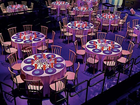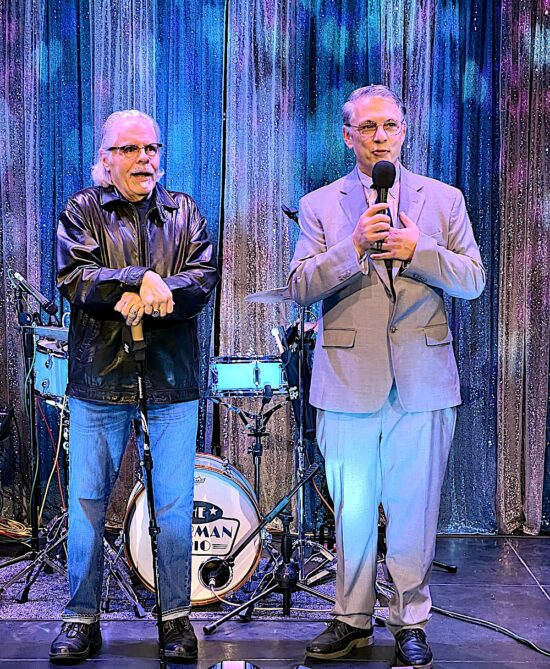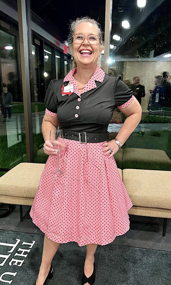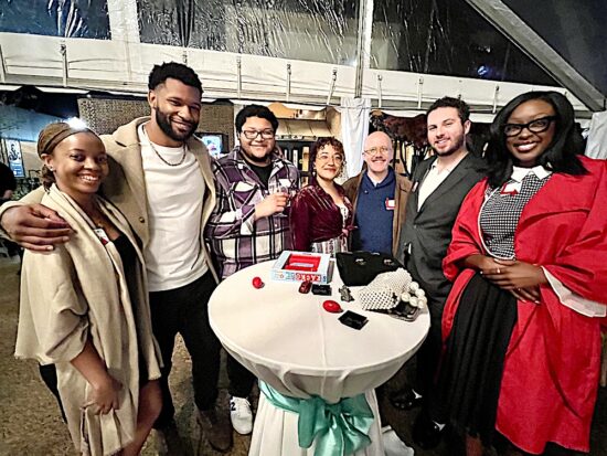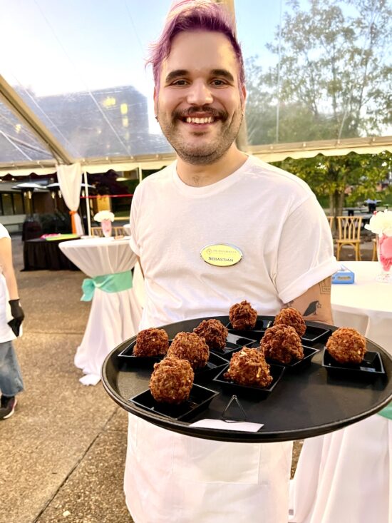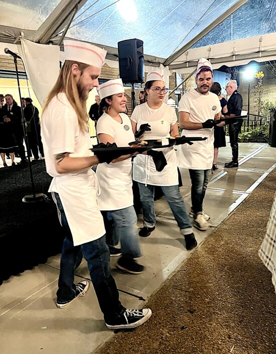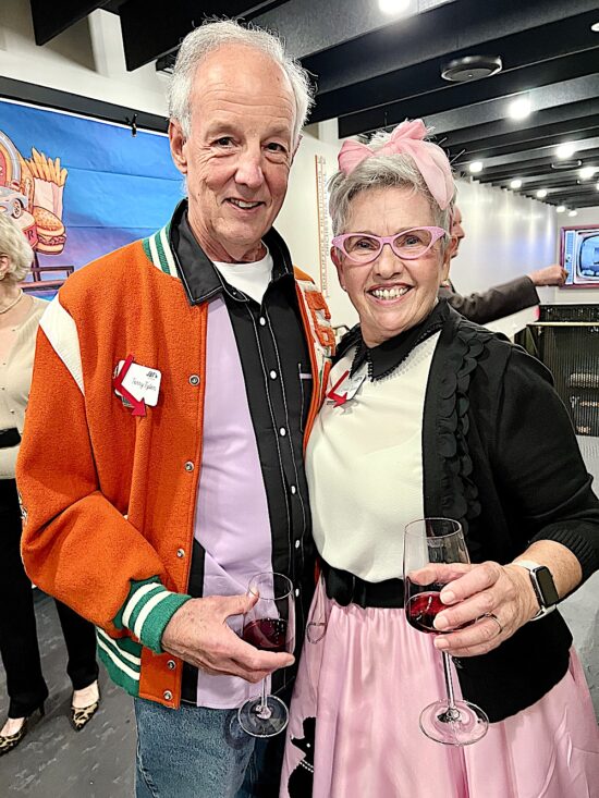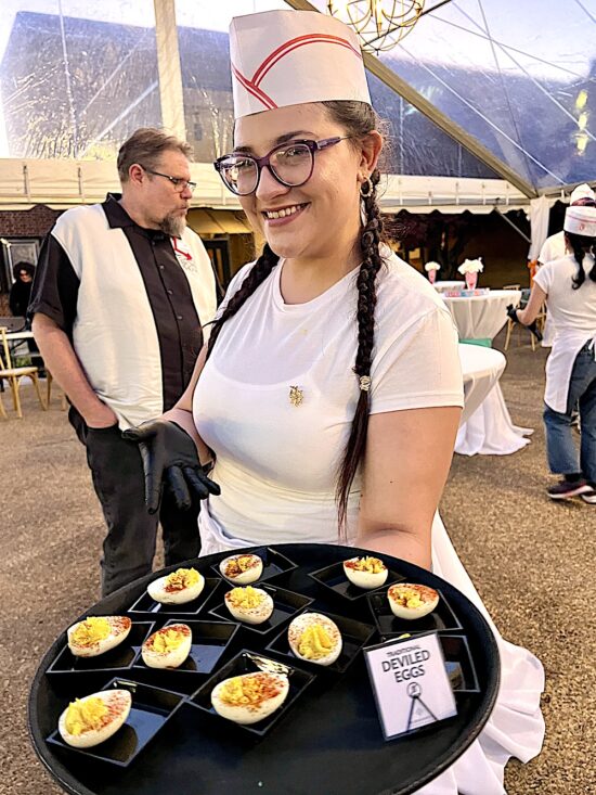 The $250-per-plate event called “Dinner with Friends” featured a 1950s theme, which was a nod to the founding in 1951 of the Carousel Theatre, the predecessor to the Jenny Boyd Theatre. The evening started with appetizers and drinks under a tent between the Clarence Brown Theatre and the Jenny Boyd Theatre. Servers dressed as carhops distributed ’50s-era treats like sausage balls, Pigs in the Blanket, and deviled eggs.