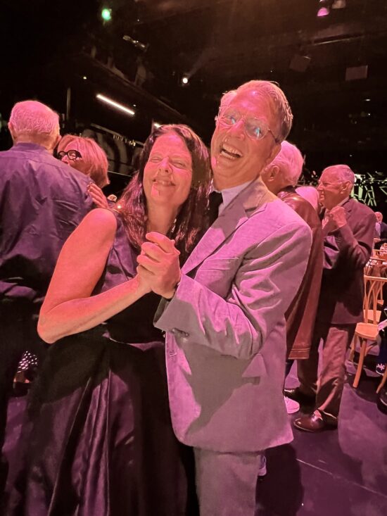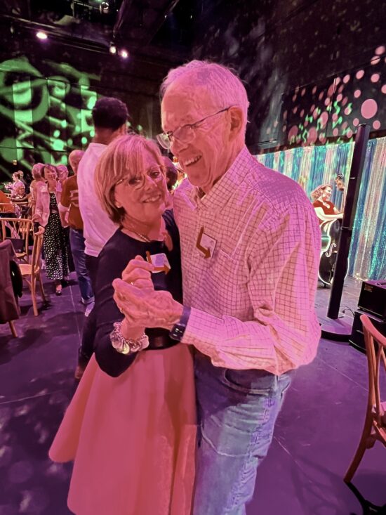 Katie and Jed Diamond dancing at their seats.