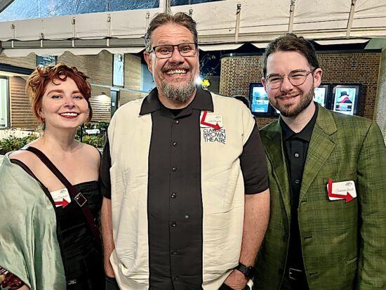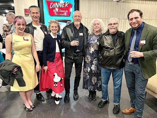 In the lobby of the new theater were some more picture-taking opportunities. From left: Katie Diamond, Terry Weber, Jeni Lamm, Jed Diamond, Susan Creswell, Tom Cervone, and Zack Fine.