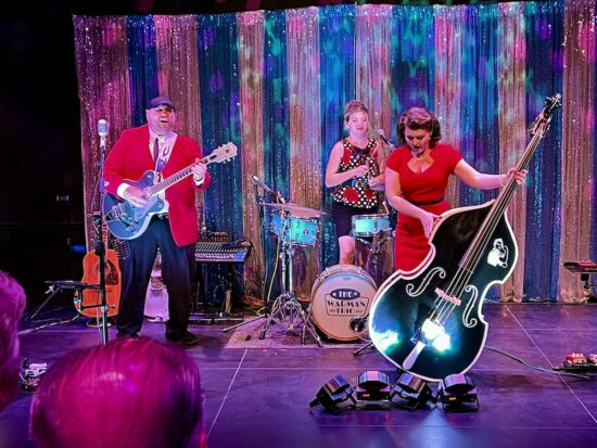 The Warman Trio consists of, from left, the father, Rick; the elder daughter, Presley Jewell, on bass (literally!); and younger daughter, Jessica Faith, on drums.