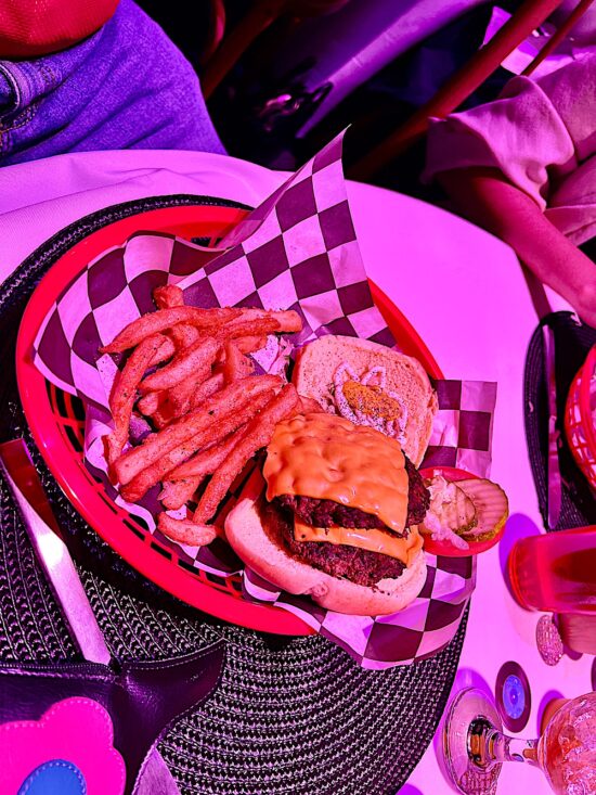 Inside, we had burgers and fries in plastic baskets like at the drive-in in the good ole days. Dessert was a sundae ice cream bar.