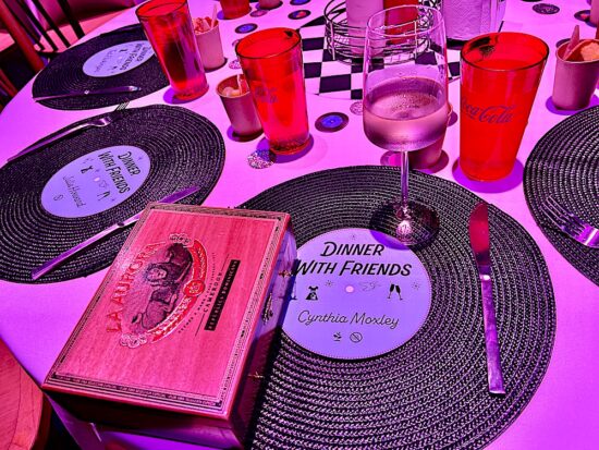 Where our place mats looked like record albums! (That’s my cigar box purse.)