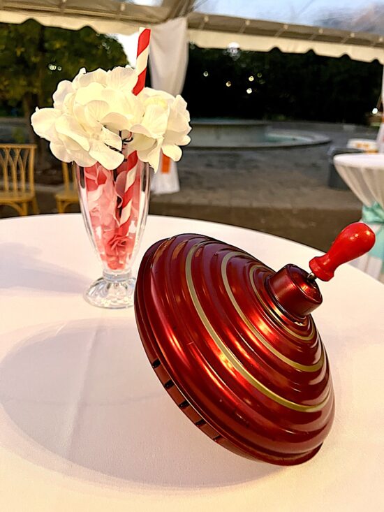 The cocktail tables were decorated with classic toys and other items.