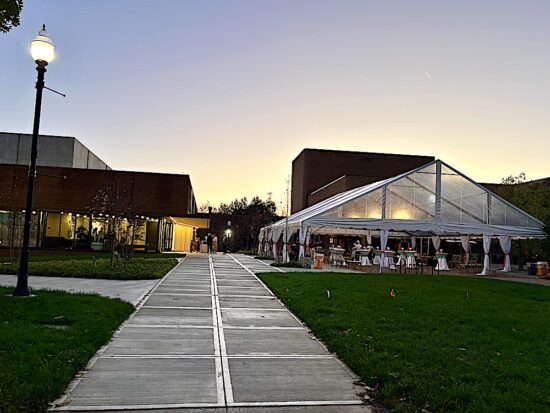 Here’s the setting as folks were were approaching from the parking garage at the Humanities Building on campus. The Jenny Boyd Theatre is to left, the Clarence Brown Theatre is in the back of the huge tent.