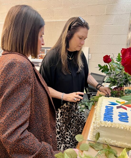 Caterer Tracy Malone cuts the cake as Alison Oakes looks on.