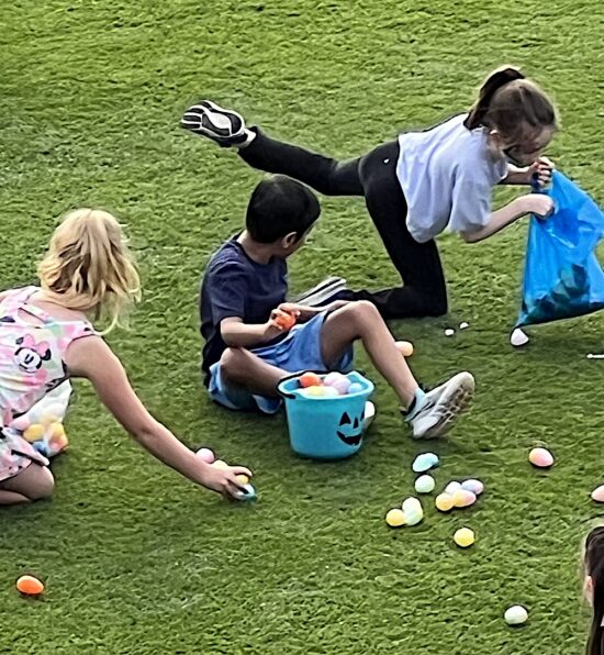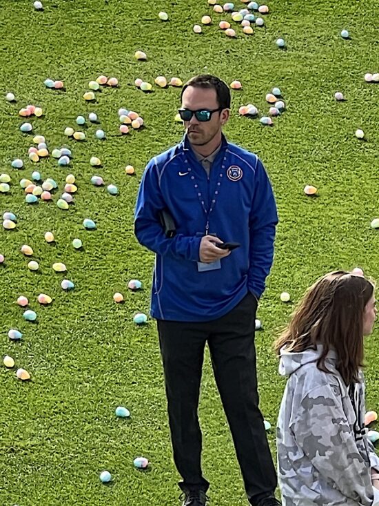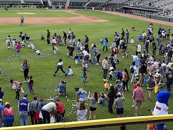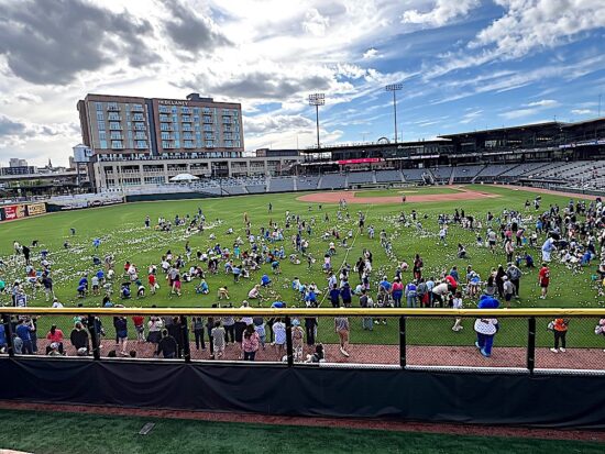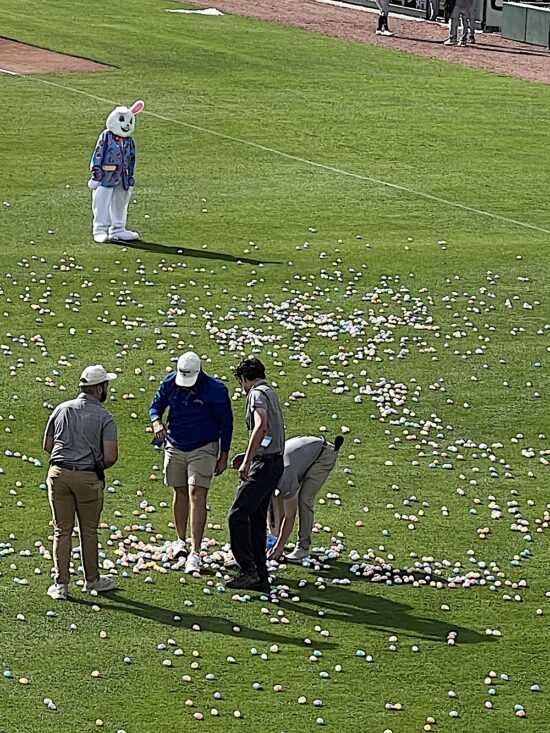 When the game finally ended, this happened! Workers began dumping out what must have been thousands of plastic Easter eggs filled with candy! An announcement was made for children under 12 to get in lines to enter the field and claim the eggs.